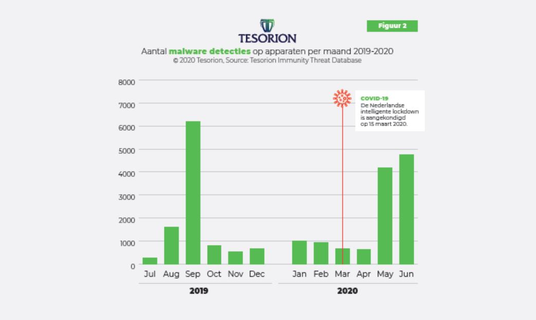 Tesorion zag in maart van dit jaar het aantal malware detecties op de vier miljoen apparaten van haar klanten dalen naar zo’n 600 per maand. In mei volgde een explosieve stijging en ging het aantal malware-incidenten gedetecteerd door