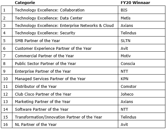 Cisco heeft bekend gemaakt welke Nederlandse partners de zestien awards hebben gewonnen voor de samenwerking met hun klanten en Cisco Nederland in Cisco’s boekjaar 2020. Voor het leveren van Cisco’s technologie en de dienstverlening aan klanten is goede samenwerking met partners doorslaggevend. Ieder jaar reikt Cisco in Nederland awards uit aan de partners die een grote groei hebben gerealiseerd op bepaalde gebieden of die zich op een andere manier hebben weten te onderscheiden.