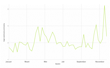 Terugkijkend naar de maand november blijkt dat pakketten die zijn besteld in de week van 16 november (week 47) veel vertraging hebben opgelopen. Het duurde gemiddeld 4,2 dagen voordat deze bestellingen geleverd werden. 13,9 procent van de bestelde pakketten in week 47 werd pas twee weken (week 49) later geleverd. Het aantal zendingen in week 47 was ook opvallend hoog in vergelijking met de rest van het jaar. Van de in week 48 verstuurde pakketten is het merendeel inmiddels geleverd. Slechts 1,65 procent is nog onderweg. De gemiddelde levertijd van week 48 staat nu op 2,5 werkdag. Omdat nog niet alle pakketten geleverd zijn, loopt dit gemiddelde nog iets omhoog. Echter zal het niet hoger uitkomen dan 3 werkdagen, schat Wuunder.