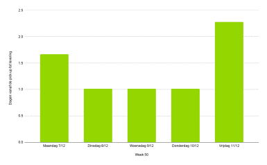 De pakketdrukte valt deze week (week 50) mee. Op de meeste dagen (dinsdag, woensdag en donderdag) zullen zendingen binnen 1 dag worden afgeleverd. Dit zijn normale bezorgperiodes. De piek op maandag 7 december werd veroorzaakt door zendingen van eind vorige week die nog opgehaald moesten worden. Dit wordt veroorzaakt door sinterklaascadeaus die te laat besteld zijn. De piek op vrijdag wordt veroorzaakt door het weekend: sommige zendingen die worden opgehaald op vrijdag kunnen pas maandag 14 december geleverd worden.