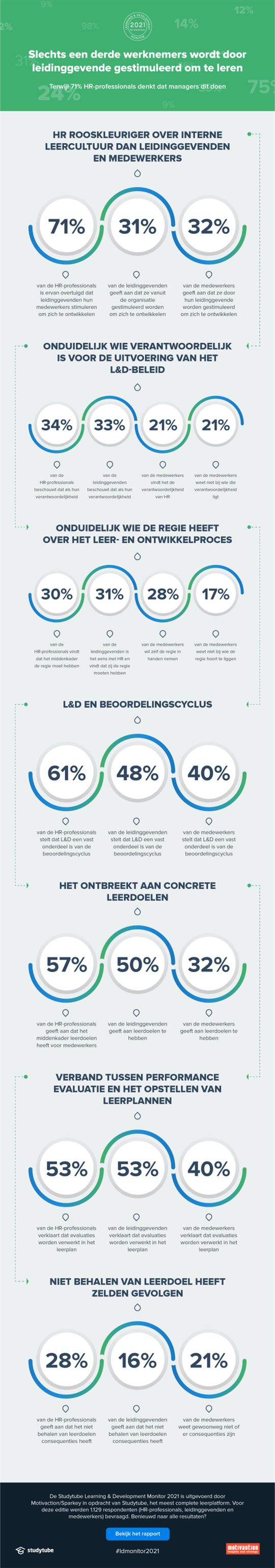 Amsterdam, 12 januari 2021 -- 71% van de Nederlandse HR-professionals is ervan overtuigd dat leidinggevenden hun medewerkers actief stimuleren om zich te ontwikkelen, terwijl slechts 31% van de leidinggevenden en 32% van de medewerkers dat ook zo ervaren. In het algemeen hebben HR-afdelingen een rooskleurig beeld van de interne leercultuur, maar in de praktijk ontbreekt een duidelijke rolverdeling, waardoor niemand écht de regie in handen neemt en het leerproces hapert. Dat blijkt uit de Studytube L&D Monitor 2021, een onderzoek van Motivaction/Sparkey in opdracht van Studytube.