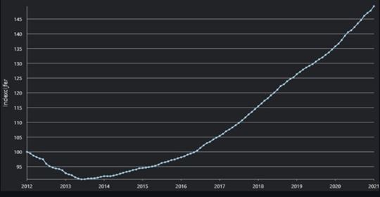 In januari 2021 stegen de woningprijzen in Nederland met meer dan 1%. Een forse stijging. Ten opzichte van een jaar geleden stijgen de prijzen met ruim 10%. De rijwoningen stijgen het meest (10,4%), de appartementen het minst (9,6%). Zie de groei van het indexcijfer in figuur 2.