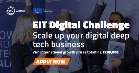 EIT Digital Challenge 2021, de belangrijkste competitie voor Europese digitale ‘deep tech’ bedrijven is geopend. Snelgroeiende start-ups met een bestaande klantenkring - zogenaamde scale-ups - zijn bij dezen uitgenodigd om zich aan te melden voor een van de vijf themagebieden: digital tech, digital cities, digital industry, digital wellbeing en digital finance. De drie winnaars ontvangen prijzen met een totale waarde van 250.000 euro; contant of in de vorm van ondersteuning.