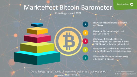 Nagenoeg alle Nederlanders (91%) zijn bekend met de Bitcoin en 25% geeft aan het investeren in de Bitcoin te overwegen. Er wordt zelfs door 14% aangegeven het komende jaar zeker, dan wel waarschijnlijk de eerste belegging in Bitcoins te gaan doen.
