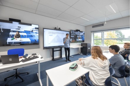 Verder werden in elk lokaal vijf grote schermen geplaatst: een interactief whiteboard-touchscreen voor het delen van inhoud aan de voorkant van de klas, twee videoschermen aan weerszijden van het whiteboard en twee videoschermen achter in de klas.