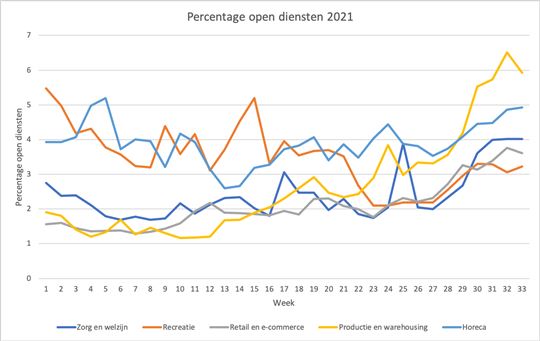 Over de hele linie is te zien dat het percentage open 'shifts' begin van het het jaar op een hoog niveau was, met name binnen recreatie en zorg en welzijn, daarna daalde en nu weer aan een sterke stijging bezig is. Met name in de horeca en productie en warehousing zitten werkgevers in de problemen en krijgen hun diensten door personeelstekort niet gevuld. In de horeca steeg het relatieve aantal open diensten vanaf week 17 tot week 33 (die vorige week zaterdag eindigde) van 3,7% naar 4,9%. Bij productie en warehousing is deze stijging nog sterker te zien: van 2,3% naar 5,9%. Het percentage in de zorg en welzijnsbranche (er is met name niet-urgente zorg meegenomen in deze dataset) steeg van 3,1% naar 4,0%, en in de retail en e-commerce van 2,0% naar 3,6%.