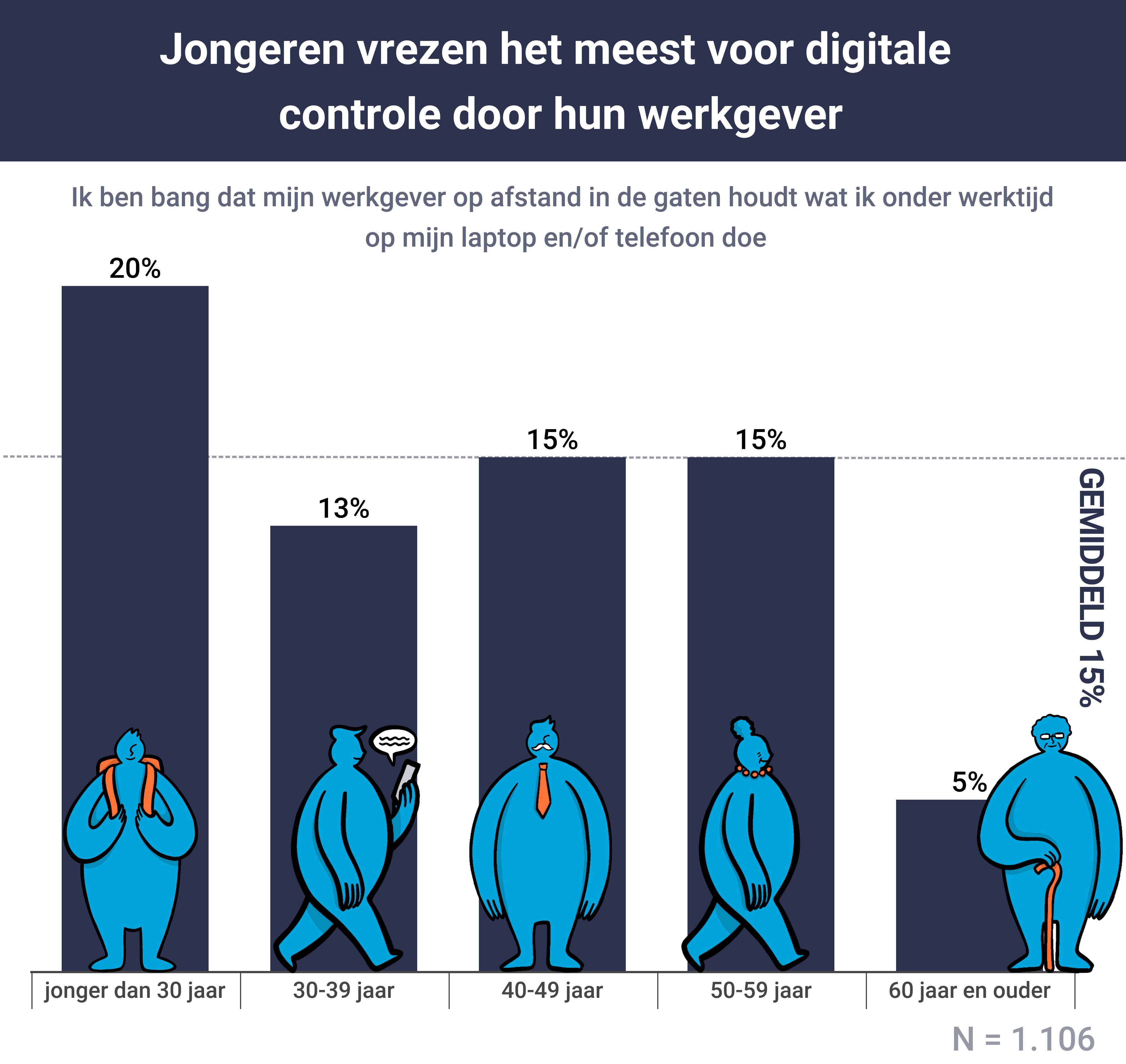 Vooral jongeren vrezen voor digitale controle door hun werkgever. Zo denkt maar liefst twintig procent van hen dat hun werkgever bijhoudt wat medewerkers op hun laptop of telefoon doen als zij vanuit huis werken. Van de zestigplussers is slechts vijf procent hier bang voor. “Door thuiswerken hebben managers deels de controle over hun personeel verloren”, zegt Abel Baas van VPNdiensten. “Sommigen proberen die controle terug te krijgen door middel van spionagesoftware of ze eisen van hun medewerkers dat zij altijd hun camera aan moeten laten staan. Niet alleen doet dat afbreuk aan hun privacy, maar als manager geef je daarmee ook het signaal af dat je je werknemers niet vertrouwt. Ik kan me voorstellen dat werknemers zich daar ontzettend oncomfortabel en gecontroleerd door voelen.”