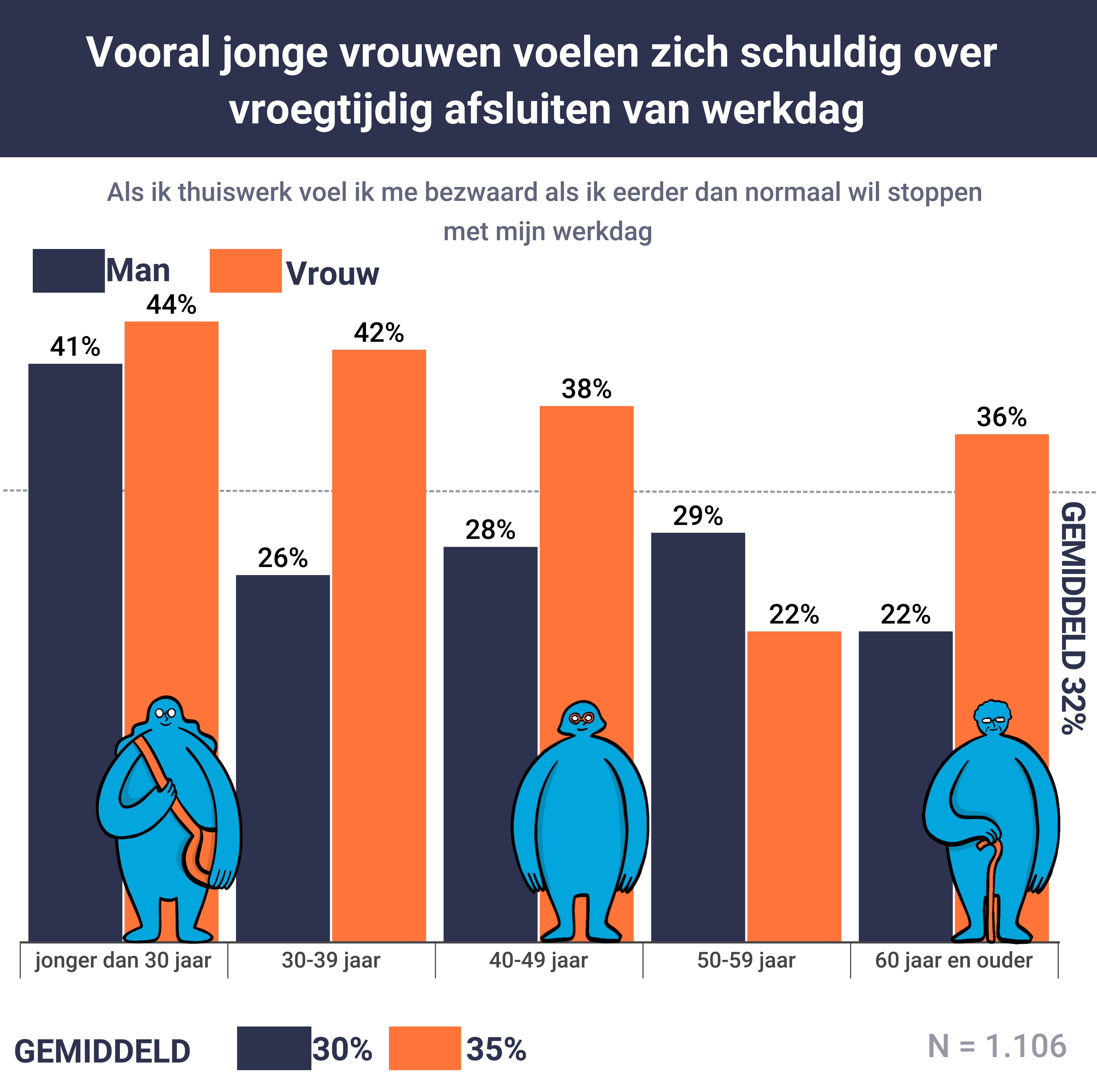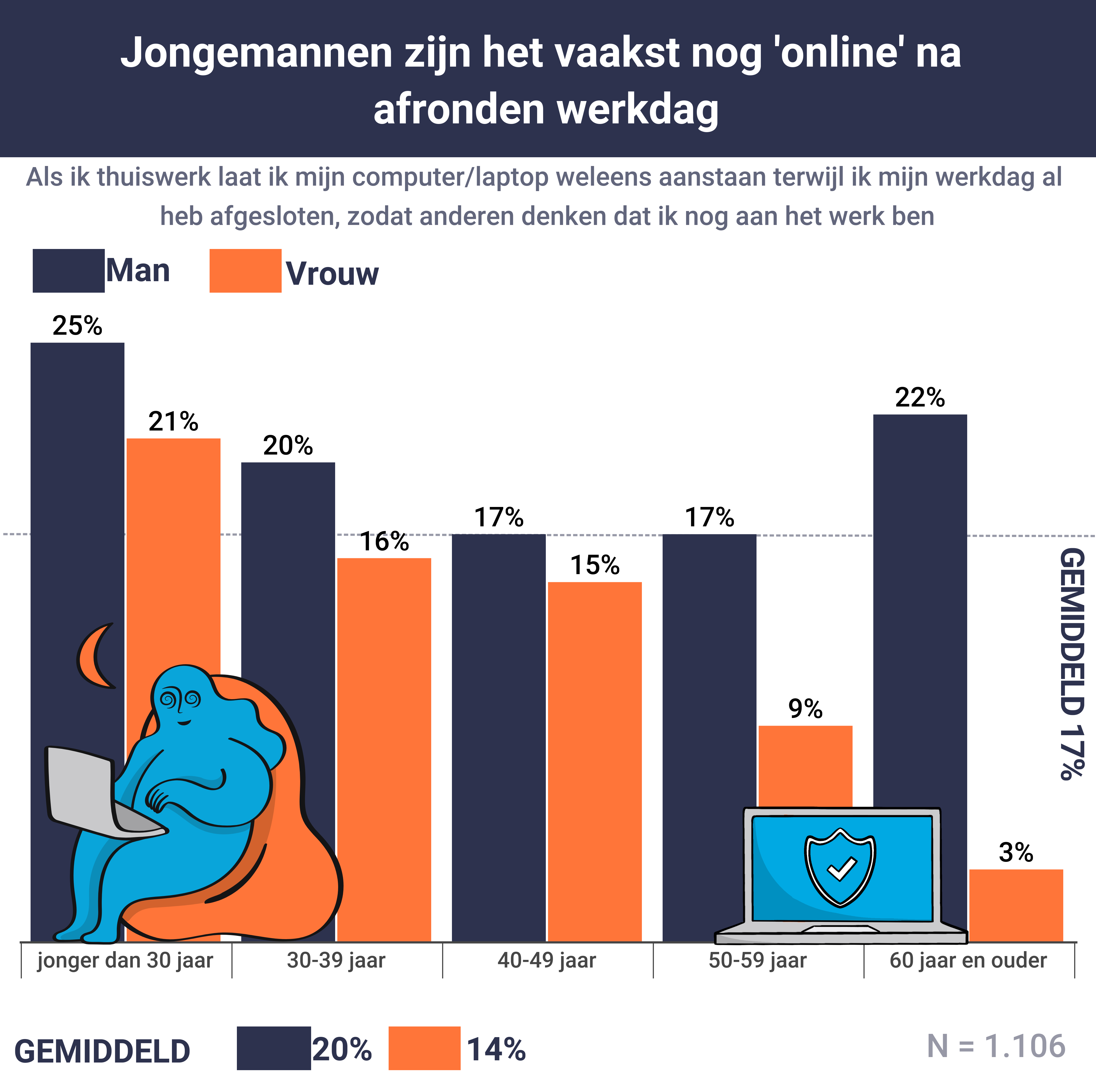 zijn. Maar liefst een derde voelt zich dan ook bezwaard als ze hun werkdag weleens eerder afsluiten dan normaal. Opvallend genoeg voelen vrouwen (35 procent) zich hier schuldiger over dan mannen (dertig procent). Ondanks dat mannen daar minder moeite mee hebben, laat maar liefst twintig procent van hen zijn laptop langer aan staan, zodat anderen denken dat zij nog aan het werk zijn. Onder vrouwen bedraagt dit percentage slechts veertien procent. Baas: “Je kan natuurlijk verschillende trucjes bedenken waardoor het lijkt dat je gewoon aan het werk bent. Veel mensen voelen zich waarschijnlijk erg gebonden aan het aantal uren dat ze per dag moeten werken. Uiteindelijk gaat het er ook om wat je in die uren gedaan krijgt. Je kan je laptop de hele dag aan laten staan maar als het resultaat er niet naar is, prikt je werkgever daar zo doorheen.”