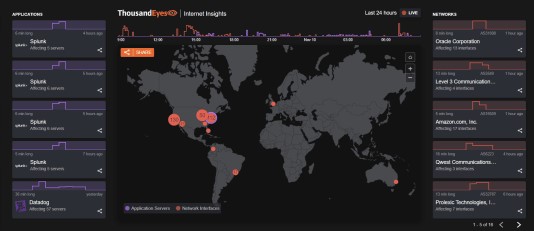 Application Outages, maakt vergelijkbare informatie zichtbaar over cloud- of SaaS-applicaties. Zo kunnen IT-afdelingen connectieproblemen bij gebruikers van bepaalde applicaties snel linken aan eventuele storingen bij cloudapplicaties. Deze informatie wordt ook verzameld door de nauwkeurige metingen van ThousandEyes en is gekoppeld aan het Internet Insights-platform van ThousandEyes.