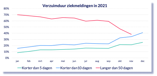Begin 2021 was slechts 1 op de 7 werknemers na 10 dagen weer aan het werk, de overgrote groep (70%) was langer dan 50 dagen ziek. Eind vorig jaar, met name in december, is het aandeel kort verzuim toegenomen tot 40%, 4 van de 10 werknemers was binnen 10 dagen weer aan de slag. Het relatief milde ziektebeeld bij de virusvariant Omicron is daarbij de voor de hand liggende verklaring.
