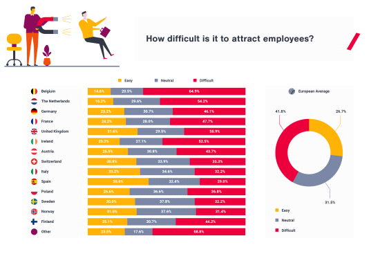 war for talent, bevestigt het onderzoek van SD Worx. Waar 54 procent van de Nederlandse werkgevers aangeeft dat zij moeite hebben om werknemers aan te trekken, ligt het Europese gemiddelde op 42 procent. In België (65%) ligt dit percentage het hoogst en ook Ierland (53%) geeft aan veel moeite te hebben met het aantrekken van nieuwe mensen. Landen zoals Zweden (32%), Italië (32%), Noorwegen (31%) en Spanje (29%) lijken het iets minder moeilijk te vinden om vacatures in te vullen.