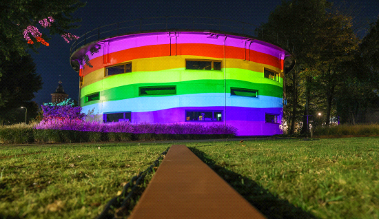 Op het gebouw van Snakeware bouwt zich ’s avonds om de paar minuten een stralende regenboogop. Ate van der Meer van Snakeware: ”We leveren graag een bijdrage aan dit mooie evenement, dat licht en blijdschap geeft aande inwoners en omwonenden van Sneek. Ook willen we op deze manier onze betrokkenheid met de LHBTIQ+-gemeenschapzichtbaar maken door ons monumentale gebouw, een geklonken stalen Gashouder uit 1905, in regenboogkleuren te tooien.”