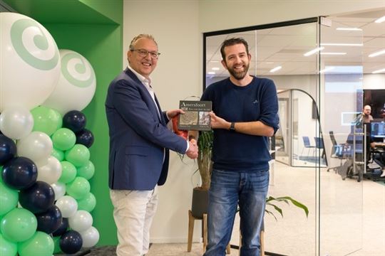 Mr. Camiel Weijzen, Accountmanager Gemeente Amersfoort, feliciteert Jelte Vrijhoef, medeoprichter en CIO van Deliverect met het nieuwe kantoor