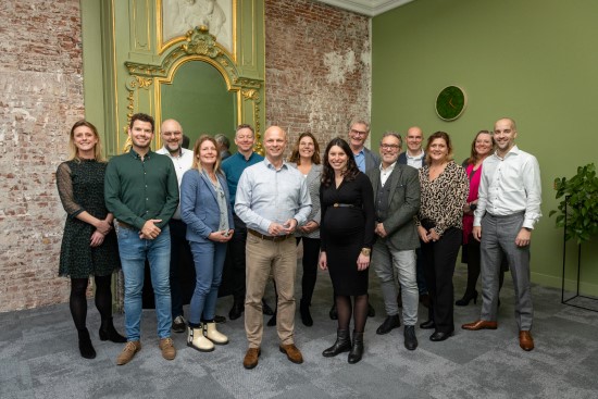 Op de foto staat het projectteam met Mark Crooijmans van gemeente Amsterdam en Celine van Hulst van Conclusion Learning Centers.