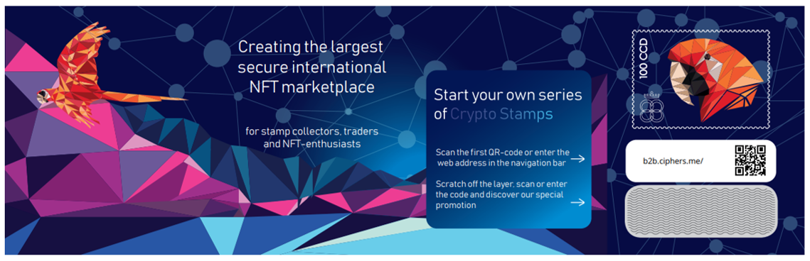 Ciphers.me, een platform voor het kopen, verzamelen en verhandelen van 'cryptozegels'. Deze fysieke postzegels hebben een digitale tweeling ‘Non-Fungible Token' (NFT), die veilig online kan worden verhandeld door het gebruik van blockchain-technologie.