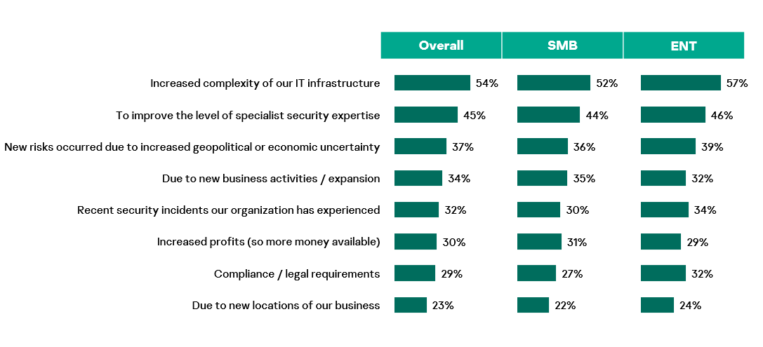 De belangrijkste redenen om de IT-securitybudgetten te verhogen zijn vooral de complexiteit van de IT-infrastructuur (46% van mkb, 54% van grote ondernemingen), en een behoefte om het niveau van specialistische security-expertise te verbeteren (36% mkb, 34% grote ondernemingen). Nieuwe potentiële risico’s als gevolg van toegenomen geopolitieke of economische onzekerheid werden door 28 procent van de mkb-bedrijven en 33 procent van de grote ondernemingen genoemd als redenen voor een verhoging van de investeringen.