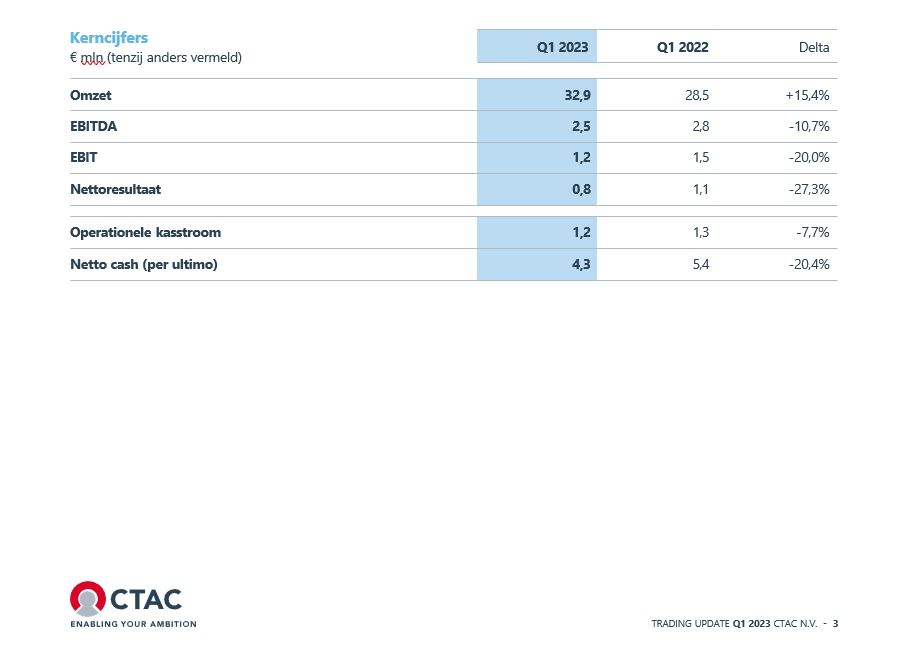 ’s-Hertogenbosch, 26 april 2023 – Business & Cloud Integrator Ctac N.V. (Ctac) (Euronext Amsterdam: CTAC)geeft vandaag een trading update over het eerste kwartaal (Q1) van 2023.