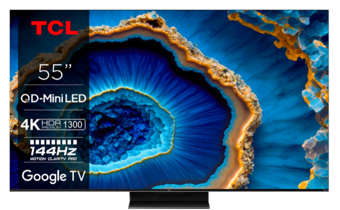 - De TCL 55C805 TV is ook een topkeuze voor gamers. Het combineert 5e generatie Full Array Mini LED, QLED, 4K HDR Premium 1300, en 144Hz Motion Clarity Pro voor krachtig nauwkeurig contrast, scherpe en kleurrijke HDR-beeldkwaliteit. Met Game Master Pro 2.0, 144Hz VRR, Game Bar, 240Hz Game Accelerator en de nieuwste ondersteunde HDR-formaten is deze TCL Mini LED TV het beste gezelschap om van games te genieten.