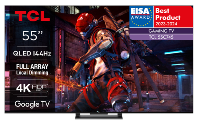 - De TCL QLED 4K TV 55C745, bekroond als winnaar van de EISA 'GAMING TV 2023-2024' award, is de ultieme keuze voor gaming op de nieuwste generatie consoles en pc's. Het combineert spectaculaire kleuren van QLED, contrast van Full Array Local Dimming en piekhelderheid met alle nieuwste gamingfuncties. Game Master 2.0, HDMI 2.1, ALLM, 144Hz VRR, FreeSync Premium Pro, TCL Game Bar, 240Hz Game Accelerator tillen de game-ervaring naar een hoger niveau. Dankzij deze functies kan de TCL 55C745 zich aanpassen aan elke gamesource. In combinatie met AMD FreeSync-technologie, die naadloos, artefactvrij gameplay belooft bij bijna elke framesnelheid, kunnen gebruikers de volgende doorbraak in pc- en console gaming verwachten.