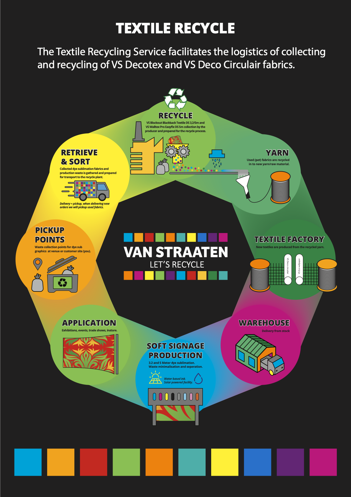 Omdat het verduurzamen van de hele keten voor Van Straaten van belang is, wordt ook daarin geïnvesteerd. Het bedrijf onderzoekt momenteel alle opties om een integraal recycle en een re-use programma op te zetten, waarin ze venues, evenementenorganisatoren en standbouwers faciliteren om de gebruikte prints te verzamelen, waarna Van Straaten ze ophaalt en opnieuw verwerkt.