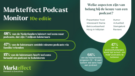 De populariteit van de podcast blijft in Nederland onveranderd hoog. Het aantal luisteraars is sinds 2019 ongeveer verdubbeld en het aantal te beluisteren podcasts is verveelvoudigd. Inmiddels luistert 48% van de Nederlanders wel eens naar een podcast. Onder jongeren (12-18 jaar) is dit zelfs 66%. Verder bleek de podcast ook een belangrijke bron bij de Tweede Kamerverkiezingen in 2023: meer dan een kwart van alle Nederlanders haalde hier informatie over op via het medium. Dit blijkt uit de 10e meting van de Markteffect Podcast Monitor, een halfjaarlijks onderzoek dat al sinds 2019 wordt uitgevoerd.