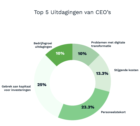 softwareontwikkelaar Klippa onthult dat een kwart van de Nederlandse CEO's het gebrek aan investeringskapitaal als hun grootste uitdaging ziet. Voldoende kapitaal om te investeren is essentieel voor de groei van een organisatie en productontwikkeling, wat de trend zorgwekkend maakt voor Nederlandse bedrijven. Een ander groot probleem voor CEO’s is het aanhoudende personeelstekort, wat door ruim 23% van de bestuurders werd genoemd.