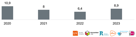 Ongeveer de helft van alle online aankopen werd in 2023 gedaan via de desktop/laptop. Dit aandeel is stabiel ten opzichte van 2022. Het gebruik van de smartphone is opnieuw toegenomen (van 33% naar 35%), maar de snelle groei van de afgelopen jaren lijkt iets af te zwakken. Daar waar het toegenomen gebruik van de smartphone de afgelopen jaren vooral ten koste is gegaan van het gebruik van desktop of laptop, is dit in 2023 vooral ten koste gegaan van het gebruik van de tablet.