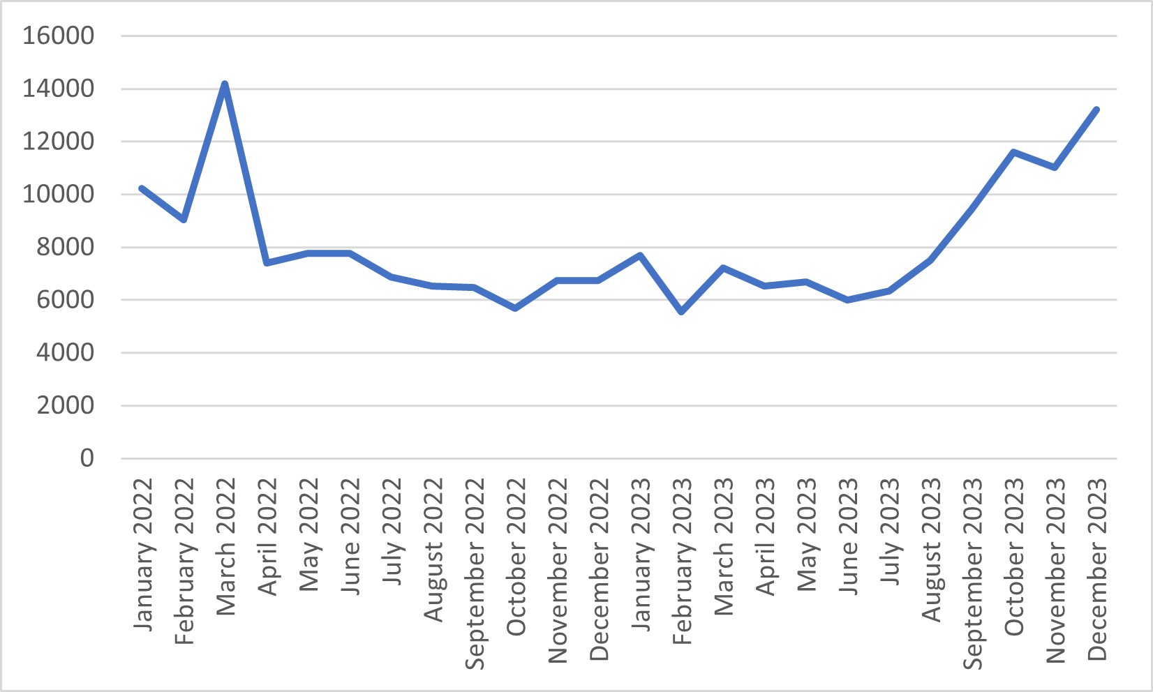 Aantal Android-gebruikers aangevallen door bancaire malware per maand, 2022 – 2023