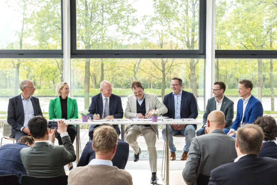 Onderstaande rechtenvrije foto is geschikt voor publicatie. Van links naar rechts op de foto: Ron Kolkman (CIO, Rijkswaterstaat), Judith Tolk (CCO, Quanza), Martijn Wijnen (Directeur Generaal, Rijkswaterstaat), Seger Theuns (Managing Director, Conclusion), Marc de Beer (Director, Conclusion Mission Critical), Gert Heysteeg (Board Member, Conclusion) en Adriaan Schutte (Directeur IRN, Rijkswaterstaat).