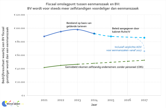 Alfred Griffioen van Winstdelen.com: "De MKB-winstvrijstelling was 14%, die is voor 2024 al omlaag gegaan naar 13,33% en deze zal in 2025 waarschijnlijk nog maar 12% zijn. Er is al besloten om de zelfstandigenaftrek te verlagen naar € 900 in 2027. Als je dat combineert met de verplichte AOV, die wel voor eenmanszaken geldt, maar niet voor zelfstandigen in dienst van hun eigen BV, dan komt het omslagpunt rond de 66.000 euro te liggen."