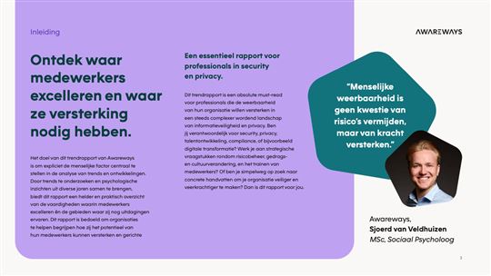 Waar vaak wordt gefocust op de mens als risicofactor, benadrukt Awareways in haar rapport juist het versterken van menselijke weerbaarheid. Nu maar nog meer naar de toekomst toe, is de weerbaarheid van organisaties en hun medewerkers van cruciaal belang in de wereld van informatieveiligheid en privacy. Deze weerbaarheid vormt de ruggengraat van een veilige en veerkrachtige samenleving. Hoewel technische oplossingen belangrijk blijven, is het gedrag van medewerkers een onmisbare schakel. Medewerkers spelen immers een sleutelrol in het herkennen en voorkomen van incidenten en in het reageren op dreigingen. Met het veranderende dreigingslandschap – waaronder toenemende activiteit van statelijke actoren (AIV, 2024), veranderende wet- en regelgeving (AVG, NIS2 en Dora) en de digitale transformatie van de samenleving (digitalisering, AI en hybride werken) – is het versterken van de menselijke weerbaarheid urgenter dan ooit.
