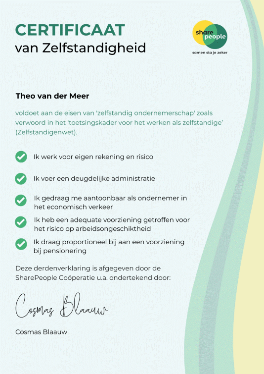 Cosmas Blaauw, initiatiefnemer van SharePeople: “Dat we in korte tijd zoveel Certificaten van Zelfstandigheid hebben uitgegeven, zegt veel over de onzekerheid bij zowel zzp’ers als opdrachtgevers bestaat. Men zoekt houvast. Natuurlijk is het zo dat ons certificaat niet 100% garantie geeft.De daadwerkelijke beoordeling van de werkrelatie, de opdracht die je uitvoert, kan tot de uitkomst leiden dat er alsnog sprake is van schijnzelfstandigheid. Maar je geeft er in ieder geval mee aan dat je staat ingeschreven bij de KvK, een BTW-nummer hebt, je werkt voor eigen rekening, een deugdelijke administratie voert, je aantoonbaar gedraagt als een zelfstandige, een AOV of ander vangnet bij arbeidsongeschiktheid hebt en actief spaart voor je pensioen.”