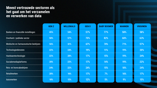 Tegelijkertijd zegt 40% van de Gen Z respondenten de overheid te vertrouwen met hun gegevens, terwijl dat vertrouwen bij Babyboomers veel hoger ligt (66%). Opvallend is dat het vertrouwen in de overheid in Nederland aanzienlijk hoger ligt dan in andere landen. In Nederland vertrouwt maar liefst 58% van Gen Z de overheid met hun data, terwijl dit onder Babyboomers zelfs 82% is.
