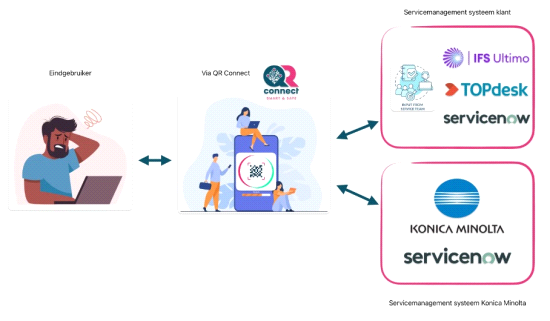 QR Connect zorgt ervoor dat een ticket automatisch wordt aangemaakt in zowel het servicemanagementsysteem van de klant als in servicenow bij Konica Minolta. Statussen blijven real-time gesynchroniseerd en zodra een melding is opgelost, wordt deze ook in alle gekoppelde systemen gesloten. Dit voorkomt dubbel werk en versnelt het volledige proces.