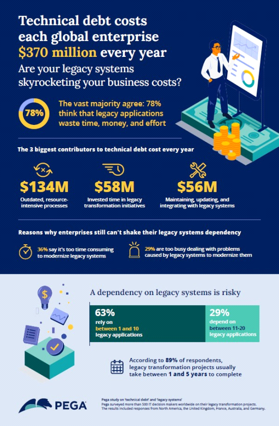 “Veel organisaties realiseren zich niet dat ze jaarlijks honderden miljoenen dollars verliezen door verouderde systemen en technical debt”, zegt Don Schuerman, CTO bij Pega. “Het is niet langer houdbaar om kostbare middelen te steken in technologie die het bedrijf eerder belemmert dan vooruithelpt. Met innovaties als