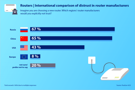 Amsterdam, 18 november 2025 – Europese consumenten hebben aanzienlijk meer vertrouwen in routers van Europese makelij dan in merken van buiten Europa. Dat blijkt uit een nieuw onderzoek van marktonderzoeksbureau YouGov. Slechts 10 procent van de ondervraagden wantrouwt Europese routerfabrikanten, tegenover 48 procent bij Chinese en 55 procent bij Russische merken. De resultaten sluiten aan bij het thema van de aankomendeEuropean Summit on Digital Sovereignty 2025(18 november), waar Europese controle over digitale infrastructuur centraal staat.