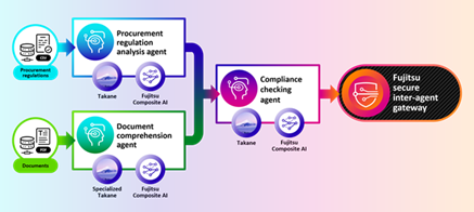 - Compliance checking agent: geautomatiseerde verificatie van compliance met dank aan gestructureerde documentdata en -prompts. Met geverifieerde aanvragen voor offertes die veilig verzonden worden naar leveranciers via de veilige inter-agent gateway van Fujitsu.