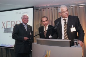 Xerox (Nederland) B.V. nam op 5 oktober jl. officieel haar nieuwe kantoorgebouw in Breukelen in gebruik. Voor de openingshandeling tekenden v.l.n.r. Huub van de Coolwijk, voorzitter van de Raad van Commissarissen, Armando Zagalo de Lima, corporate vice president en president Xerox Europe, en Valentin Govaerts, algemeen directeur Xerox (Nederland) B.V.