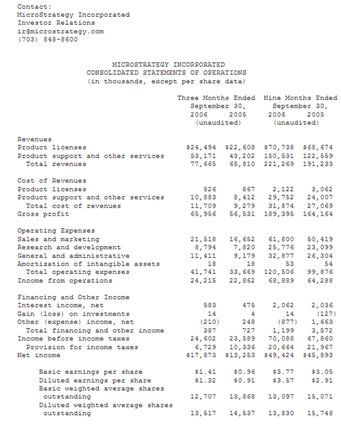MCLEAN, Va., Oct. 26 /PRNewswire-FirstCall/ -- MicroStrategy(R) Incorporated (Nasdaq: MSTR), a leading worldwide provider of business intelligence software, today announced financial results for the three-month period ended September 30, 2006 (the third quarter of its 2006 fiscal year).