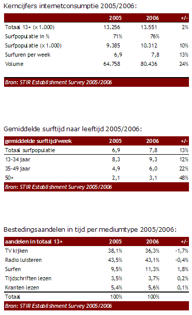 De internetconsumptie is in 2006 met 24% gestegen. Deze stijging wordt veroorzaakt door een groeiend aantal surfers én het toegenomen aantal uren dat men wekelijks op internet besteedt. Internet is hiermee het snelst stijgende medium in consumptie. De opvallendste stijging in interneturen is te zien binnen de groep 50+, waar het aantal surfuren per week stijgt van 2,1 naar 3,1; een stijging van 48%. TV en radio leveren consumptieaandeel in. De cijfers zijn afkomstig uit het Establishment Survey van de Stichting Internet Reclame (STIR). Het totaal aantal surfers (13+) nam in 2006 met 10% toe tot 10,3 miljoen. In 2005 telde STIR nog 9,4 miljoen surfers. De gemiddelde surftijd per week steeg van 6,9 uur naar 7,8 uur per week (+13%). Per week werd in 2005 bijna 65 miljoen uur gesurft. In 2006 is dat opgelopen tot ruim 80 miljoen uur, een toename van 24%.