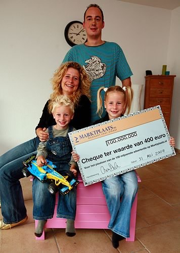 Emmeloord, 31 mei 2007 – Marktplaats.nl kondigt aan de 100 miljoenste advertentie sinds haar oprichting op haar site te hebben bereikt. Dit is nog geen anderhalf jaar nadat de grens van 50 miljoen op de grootste advertentiesite van Nederland werd behaald. De advertentie, een roze speelgoedkist, is geplaatst door Lisette en Ruud Biesheuvel uit Almere. Om deze mijlpaal te vieren, overhandigde Marktplaats.nl de familie Biesheuvel deze morgen onder meer een cheque ter waarde van 400 euro. Tevens organiseert Marktplaats.nl op 23 juni een Marktplaats-dag waar dit bijzondere moment uitgebreid met de gebruikers, die een grote bijdrage hebben geleverd aan deze mijlpaal, wordt gevierd.