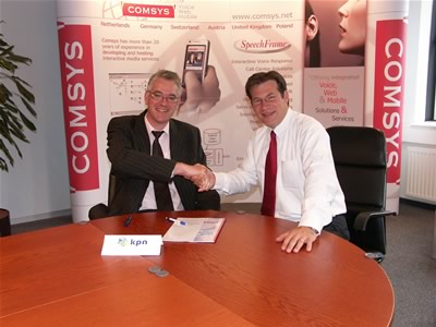 Kees de Bie, KPN Implementatiemanager en Gerrit Jan Konijnenberg, CEO Comsys bij de ondertekening van het contract.Over Comsys