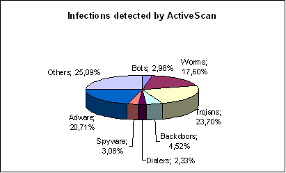 Wormen daarentegen zijn aan een snelle groei bezig. Die opmars laat zich sinds de laatste twee maanden optekenen (van 15% naar 17,60%). Adware blijft op hetzelfde niveau hangen (20,71%).