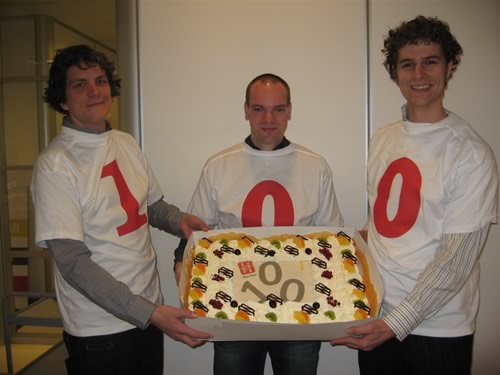 Delft, 3 maart 2008 - Tam Tam, Delfts full-service internetbureau, verwelkomt vandaag drie nieuwe medewerkers waarmee het aantal op 100 komt. In dat kader namen Romeo Vreeken (29, projectleider), Marijn Janssen (25, interactieontwerper) en Lorentz Stout (24, interactieontwerper) de taart met ‘100’ erop in ontvangst.