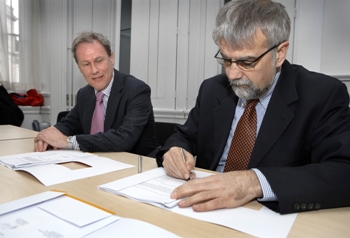 Ondertekening door Ton van Vlimmeren, directeur Programma Publieke dienstverlening, gemeente Utrecht (rechts) en Paul Vermolen, Directeur Services, Bull (links)
