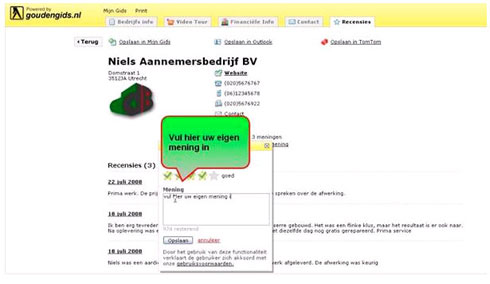 goudengids.nl. De ervaringen van de gebruikers zijn terug te vinden op de detailpagina van het gevonden bedrijf. Op de resultaatpagina van elke bedrijfsvermelding is tevens de button ‘Geef uw mening’ toegevoegd. Geregistreerde ‘Mijn Gids’ gebruikers kunnen hun waardering over bedrijven en diensten uitspreken door sterren toe te kennen en een ‘comment’ te plaatsen in een apart kader. De waardering en het gegeven commentaar is direct zichtbaar op de website.