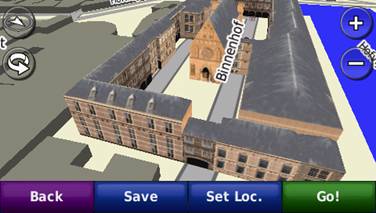3-D weergave van het Binnenhof in Den Haag. “De nüvi 7x5-serie biedt veel meer dan pure navigatie, met onder andere panoramische 3-D stadsbeelden, een miljoen nuttige punten (POI’s) en optionele aanvullingen, zoals de Oxford University Press-taalgids met duizenden woorden en zinnen. Het is net alsof je iemand bij je hebt die plaatselijk bekend is, waar je ook heen gaat”, zegt Clive Taylor, Garmin’s Directeur Product en Marketing Europa. “Extra’s zoals de rijbaanassistent en knooppuntbeeld laten duidelijk zien welke rijbaan je moet nemen op een drukke snelweg of een onbekend kruispunt. Verder hebben we nuttige punten op merknaam toegevoegd zoals BP tankstations of de lokale McDonald’s. Zo vind je nu nog gemakkelijker je favoriete stops langs een route.”