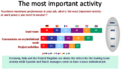 Gemiddeld besteden Europese managers 40 procent van hun tijd aan leidinggeven. 34 procent van de tijd wordt besteed aan individueel werk en de rest van de tijd aan projecten. ‘De manier van leidinggeven is blijkbaar sterk cultuur bepaald’, constateert Rick Bomer, algemeen directeur Steelcase Benelux, aan de hand van de cijfers. ‘In Nederland gaan we uit van een grote mate van zelfstandigheid en bevoegdheid. In andere landen is dat anders, dat zit diep geworteld in de culturele geschiedenis.’