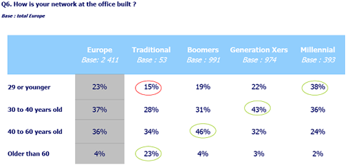 Elke generatie heeft zo zijn specifieke eigenschappen, maar ook op de werkvloer zijn de verschillen tussen de generaties duidelijk. In het onderzoek zijn er vier generaties gedefinieerd. De traditionele generatie is momenteel tussen de 63 en 80 jaar oud, dit is de kleinste groep zowel in het kantoor als ook binnen de onderzoeksgroep. De babyboomers variëren in leeftijd van 44 tot 62, mensen uit generatie X zijn tussen de 30 en 43 jaar oud en de jongste medewerkers, degenen uit generatie Y (ook wel de Millenniumgeneratie of Einsteingeneratie genoemd) zijn 29 jaar of jonger. De uitkomst van het Ipsos-onderzoek biedt inzicht in het gedrag van de medewerkers uit de verschillende leeftijdsklassen.
