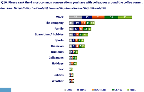 Het laat ook zien dat veel communicatie op kantoor een zakelijk karakter heeft. Dat wordt bevestigd als we kijken naar de meest voorkomende gespreksonderwerpen bij het koffiezetapparaat. Het werk scoort met afstand het hoogst. Daarna volgen de organisatie, familie en vrije tijd. Het zal niemand verbazen dat Millennials veel meer dan andere generaties over vrijetijdsbesteding praten en veel minder over familie. ‘Managers hebben soms moeite met de trend om informele communicatie te bevorderen in het kantoor, omdat ze vrezen dat kostbare werktijd verloren gaat aan irrelevante koffiepraat. Maar deze uitkomsten bevestigen wat ook al uit andere onderzoeken bleek: op kantoor praten we voornamelijk over werk’, zegt Annemieke Garskamp, werkplek kennisdeskundige bij Steelcase Benelux. ‘Ook bij het koffiezetapparaat.’